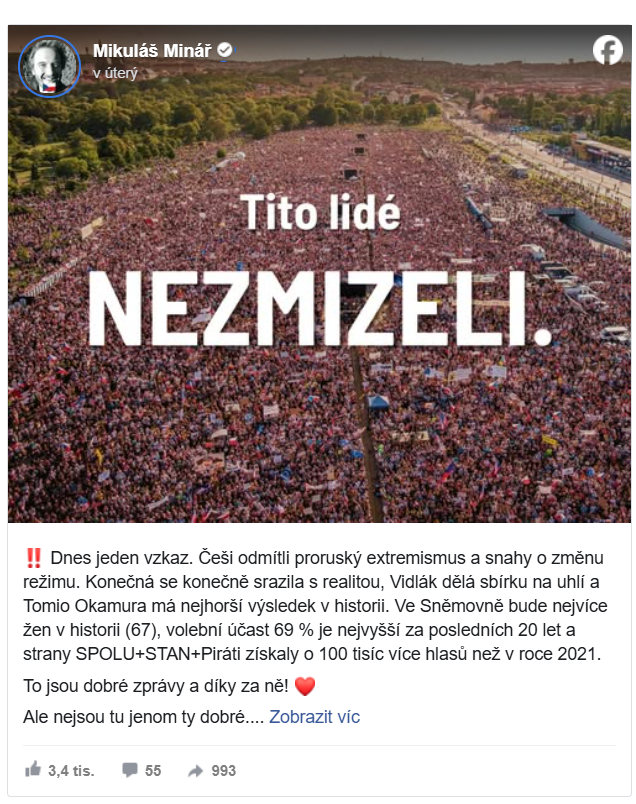 Podobnou rétoriku zvolil i expředseda spolku Milionu chvilek pro demokracii a nejspíš budoucí politruk Mikuláš Minář, který pohovořil o blížící se budoucnosti.