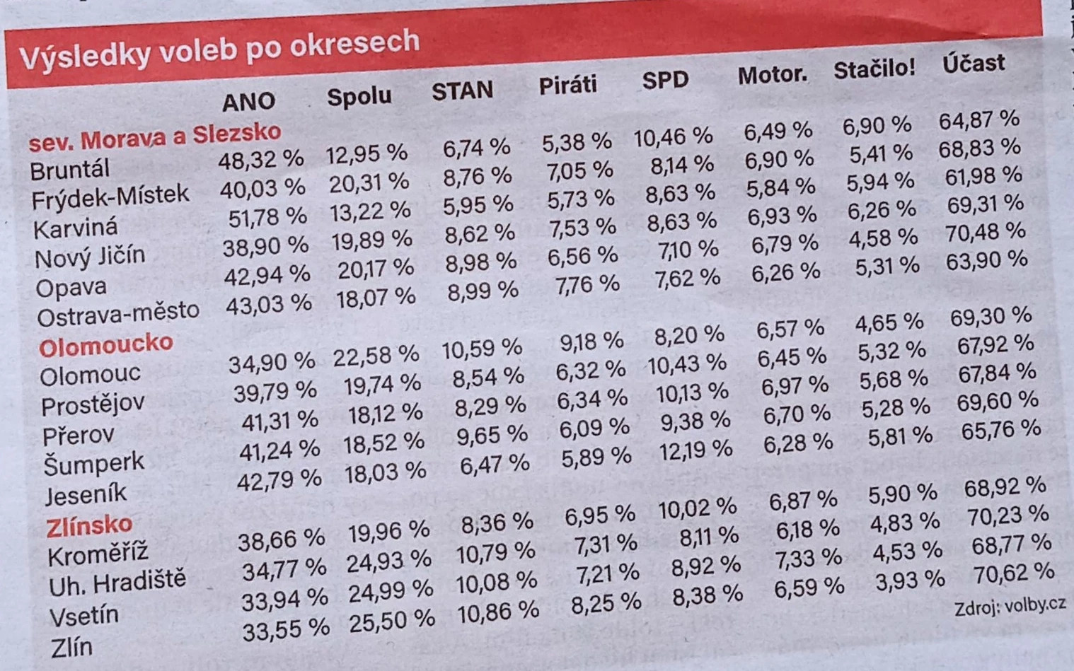 Až na bezvýznamné výjimky, kde si pár stran prohodilo pořadí, hlasovala celá severní Morava jako jeden člověk.