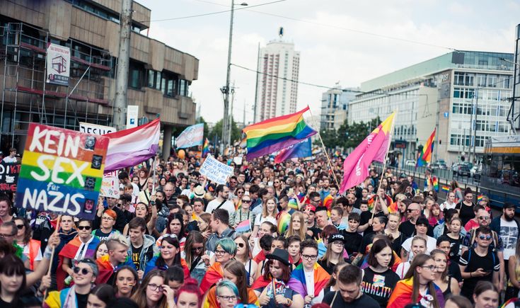 Lidé s duhovými vlajkami, nálepkami na termoskách, hesly.