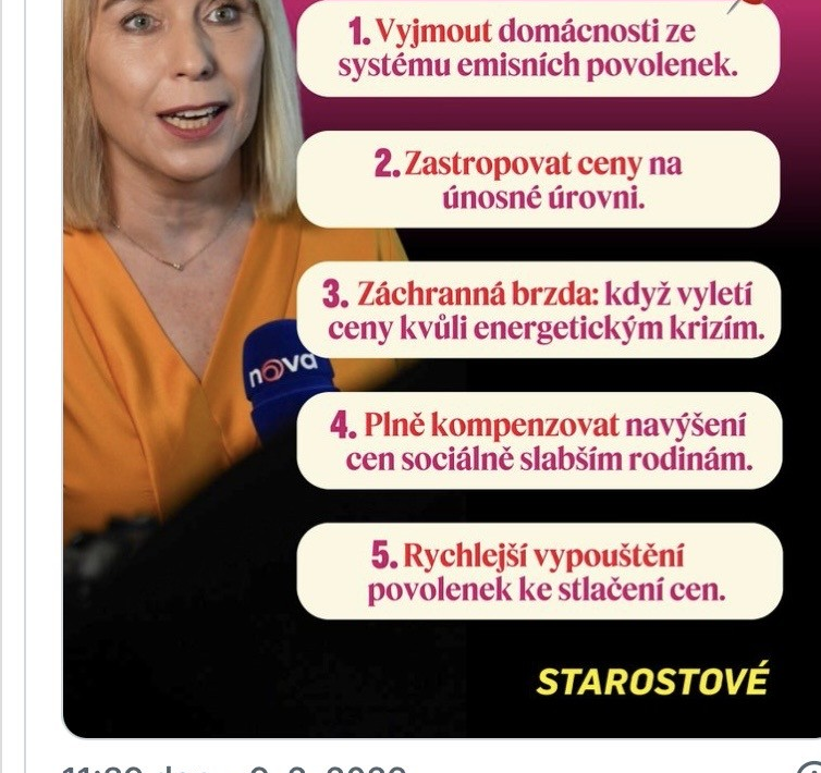 Ve propagandistickém pamfletu její mateřské strany STAN například prohlašuje, že domácnosti budou z povinnosti platit emisní povolenky vyjmuty.