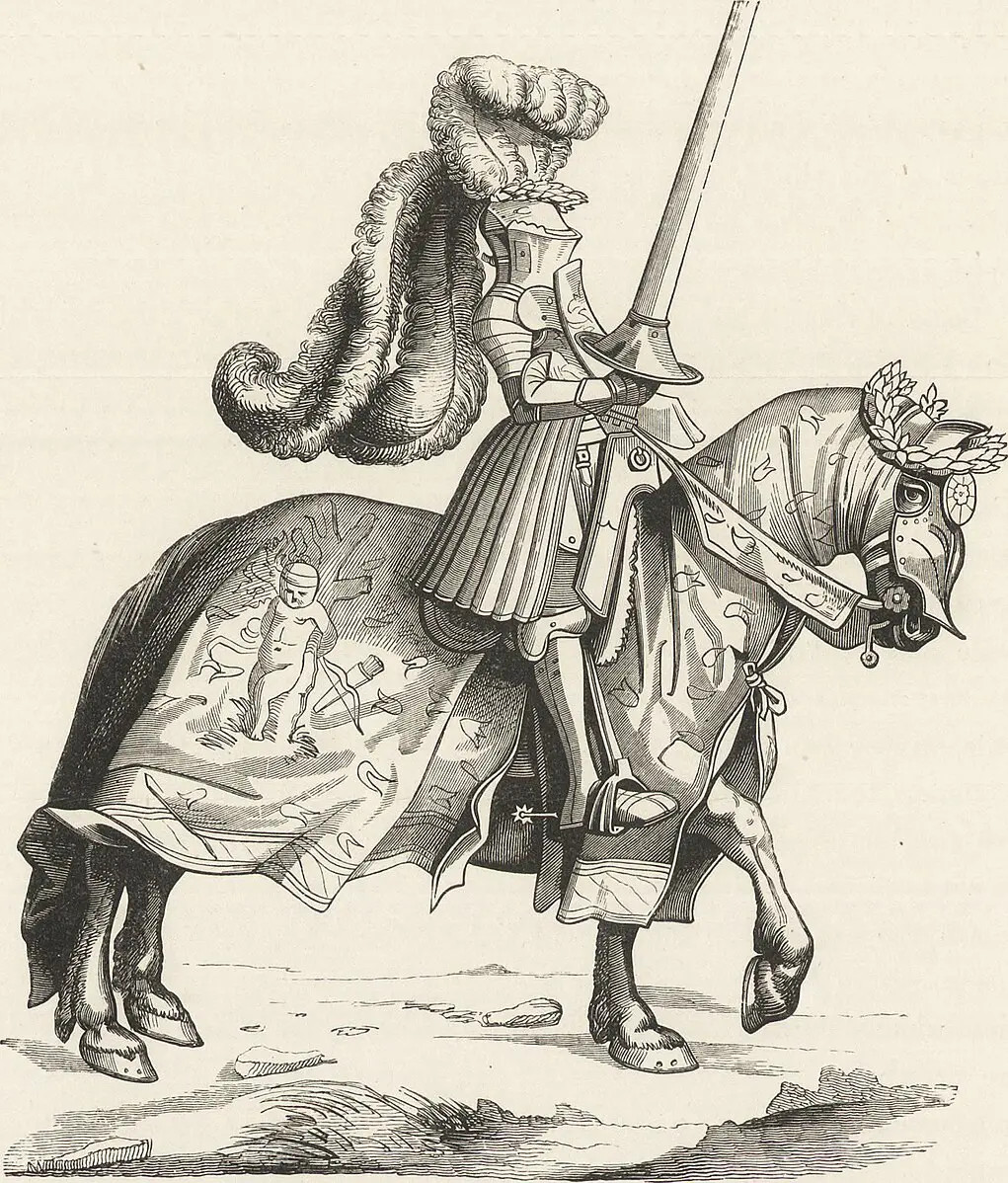 Ilustrace z knihy z roku 1870 o životě ve středověku a renesanci. Rytíř v plné zbroji, jeho kůň zdoben bohatými pokrývkami. (Public Domain)