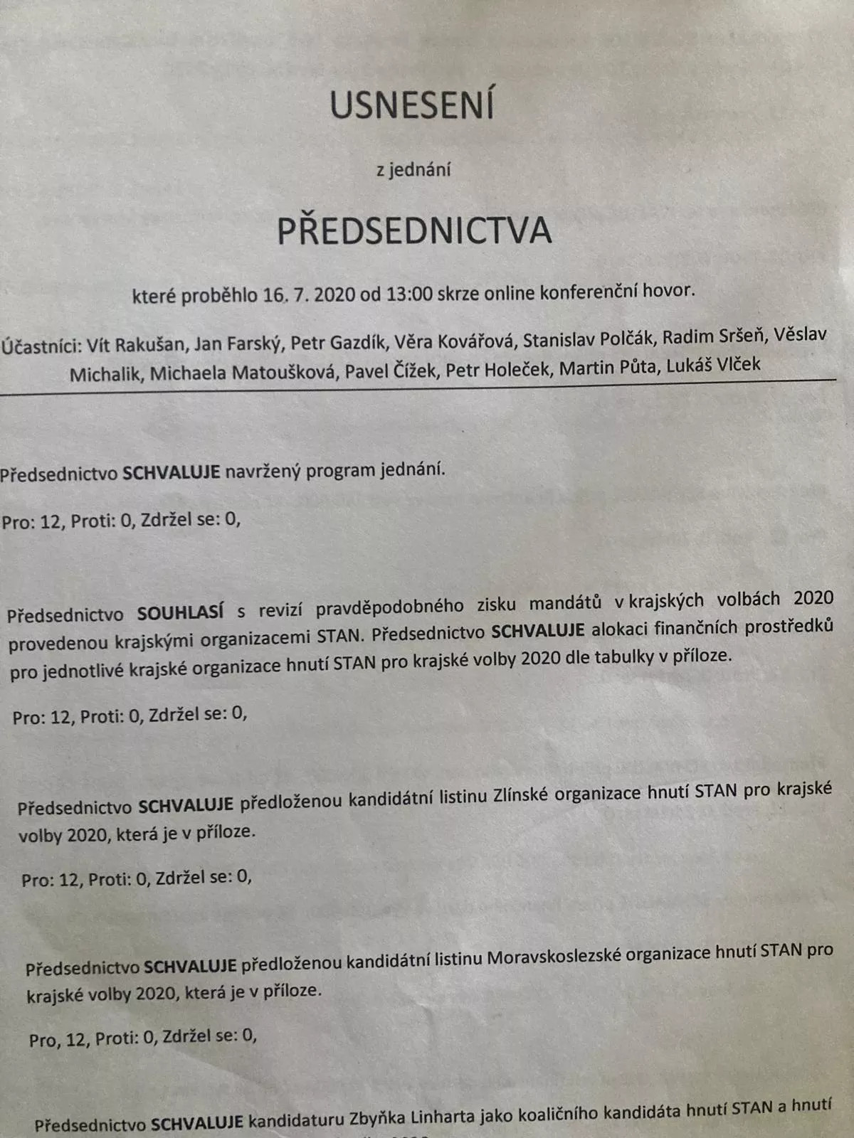 Z přepisu záznamu schůzky vedení hnutí STAN jaro 2022