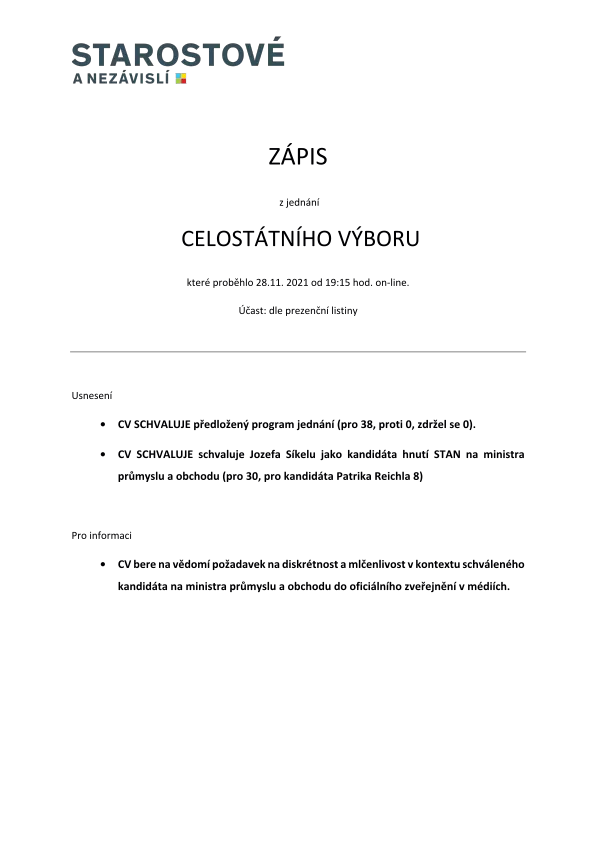 Záznamy z jednání předsednictva STANu o výběru Síkely na post ministra má redakce inFakta k dispozici.