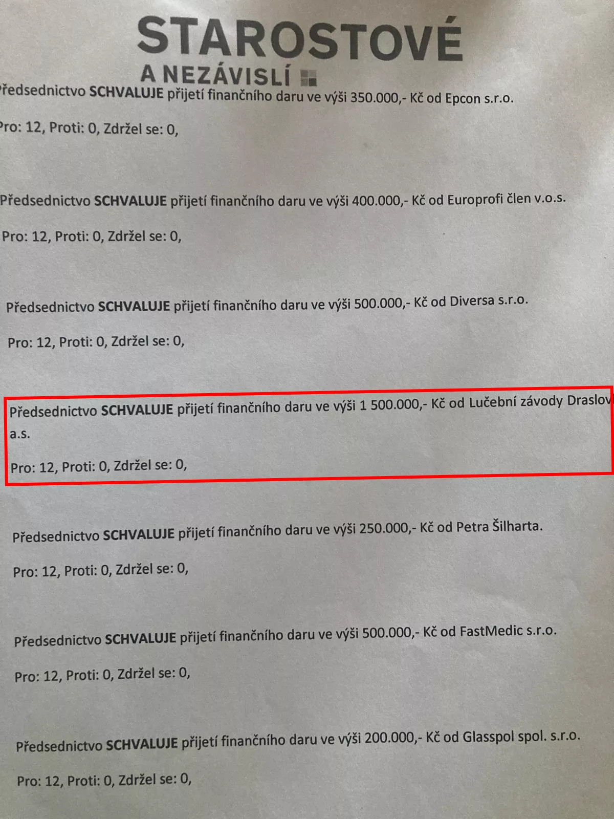 Lučební závody Draslovka Kolín (původně státní podnik) je od roku 2016 skutečně nejsilnějším donátorem hnutí STAN. Stejně tak jsou dlouhodobě nejvlivnějšími podporovateli STANu podnikatelé Vasil Bobela, Petr Pudil a Jan Dobrovský. Na kampaň do poslanecké sněmovny poslali STANu přes 5 milionů korun.