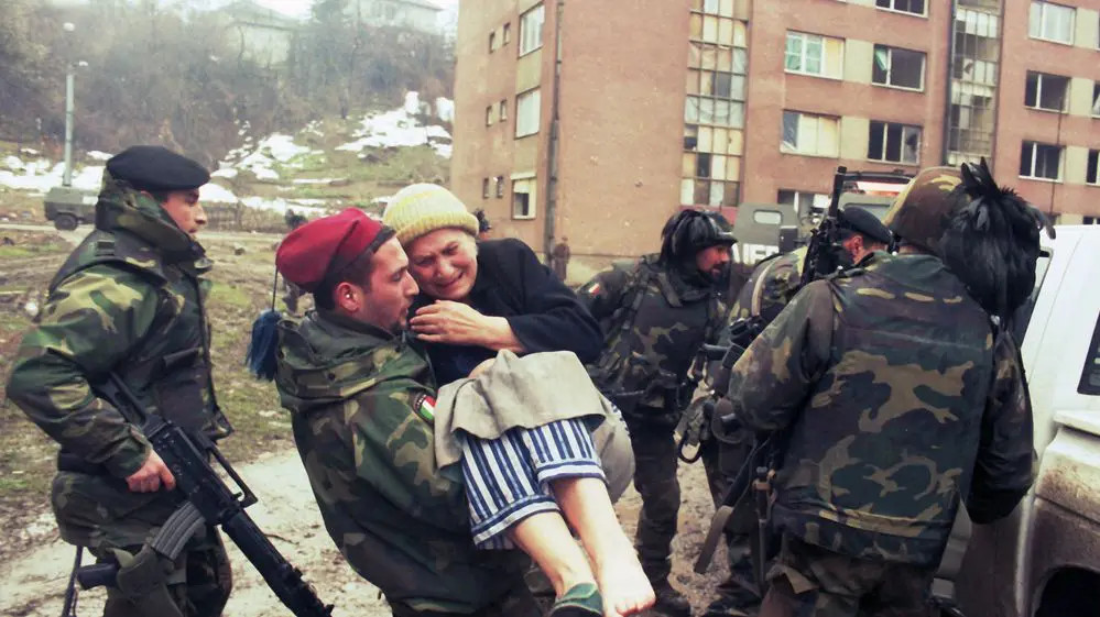 Příslušníci italské armády, která byla součástí sil UNPROFOR, pomáhají zraněné ženě dostat se do bezpečí. Sarajevo, březen 1996. Zdroj: Shutterstock.com